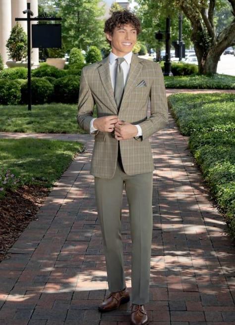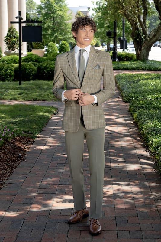 Sage Plaid Stretch Suit 4-Way Stretch Fabric 2 button Slim Fit Package Includes Coat Pant Shirt Vest Tie * Sales tax and damage waiver are not included