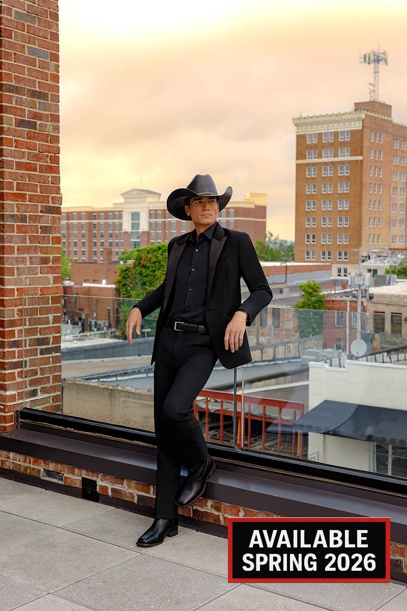 Black Dutton Western Tuxedo $236.45 - Rental Package $250.95 - Regularly A classic tuxedo with a bold western edge Satin piping yoke on front and back Scalloped Flap Pockets Pair it with boots and a bolo tie to make it your own.